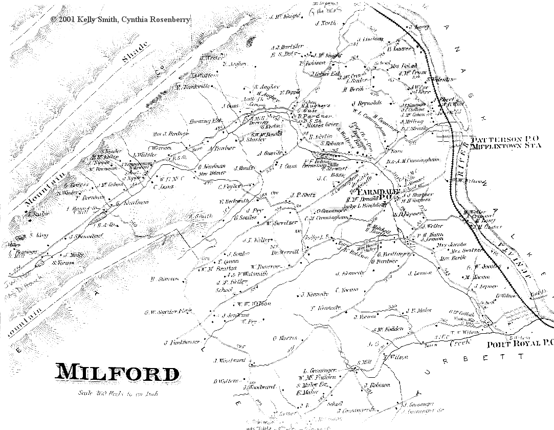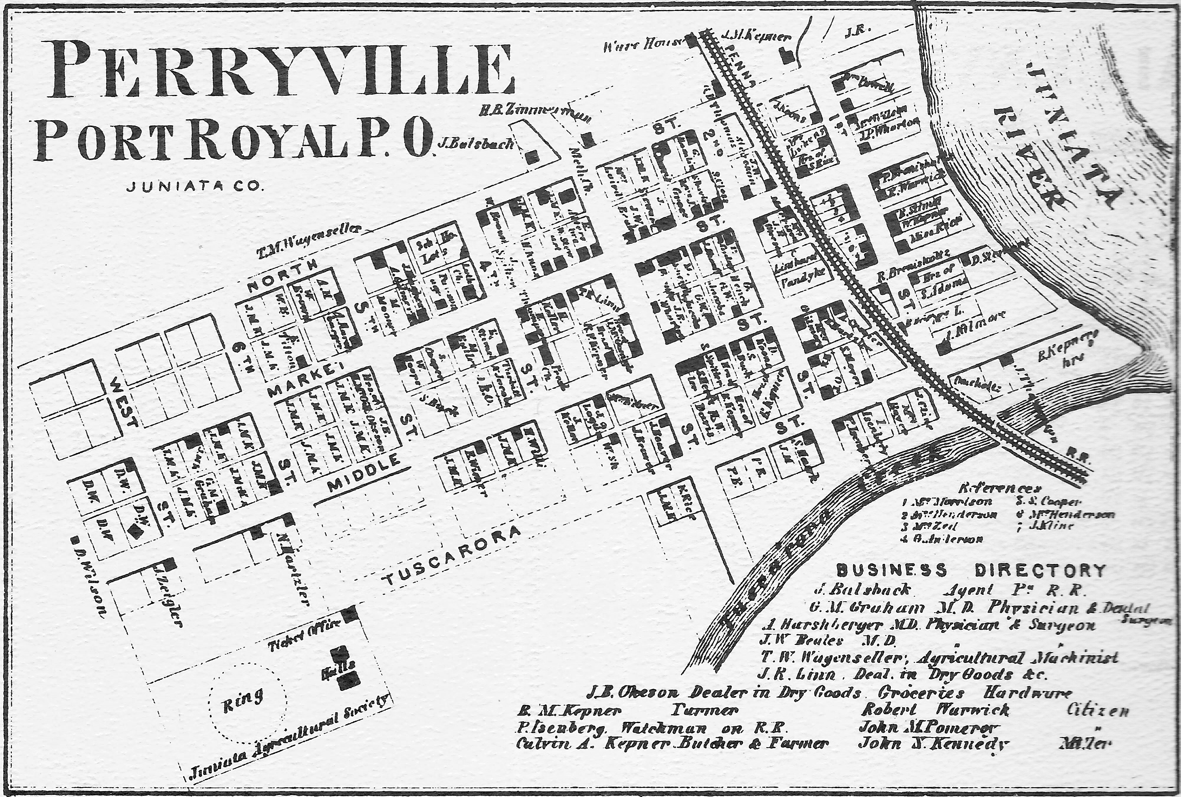 | 1877 Map of Port Royal (466K) - This map has a slight difference from the map on the History page of this site. The stone Pomeroy house is owned by a Kepner, not a Drolsbaugh as in the other map. (Belived that this map is correct.) |