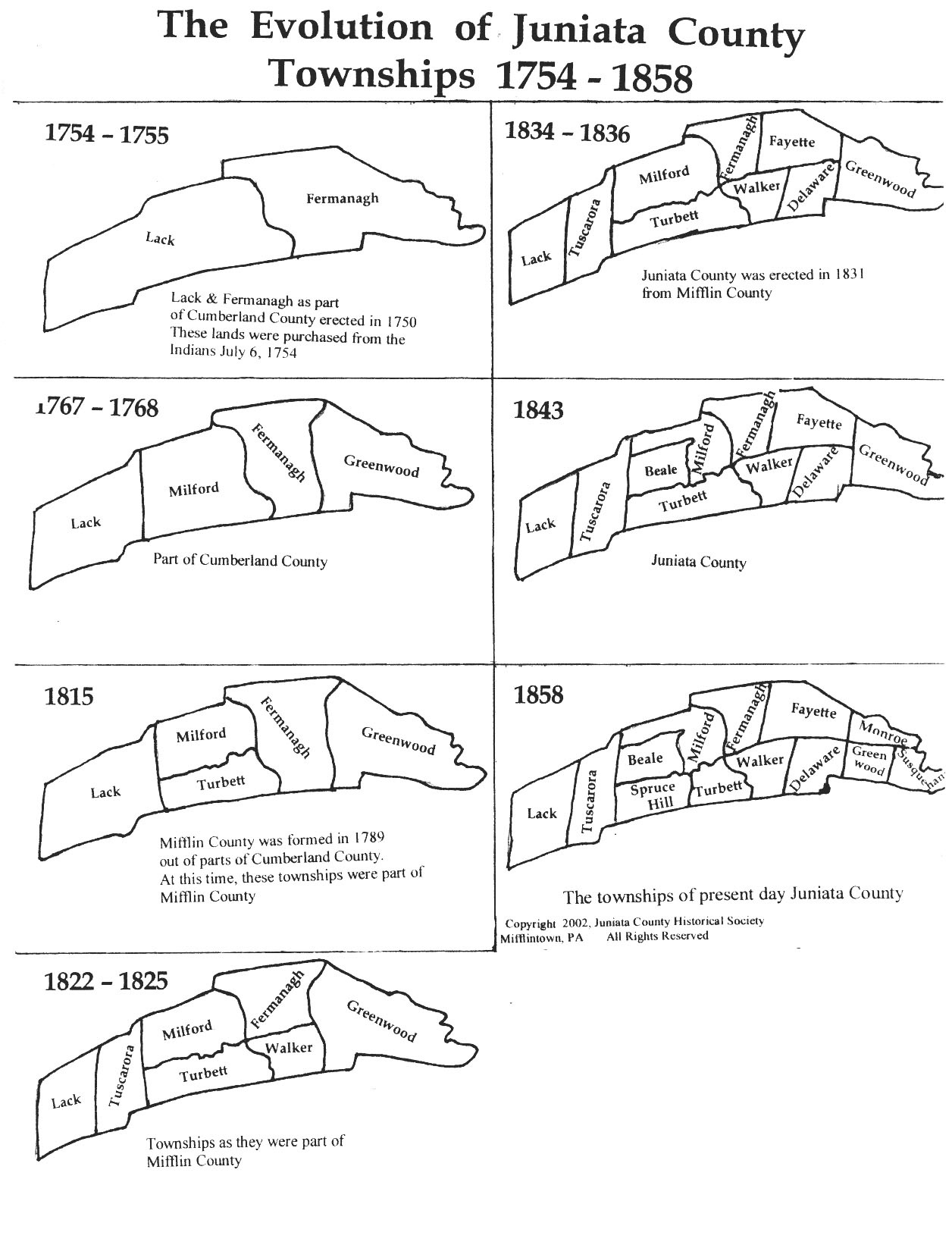 | Juniata County Townships Evolution (338K) - This map traces the township development within Juniata County. It begins with the two original townships in 1754 and progresses to the thirteen townships that exist today. |