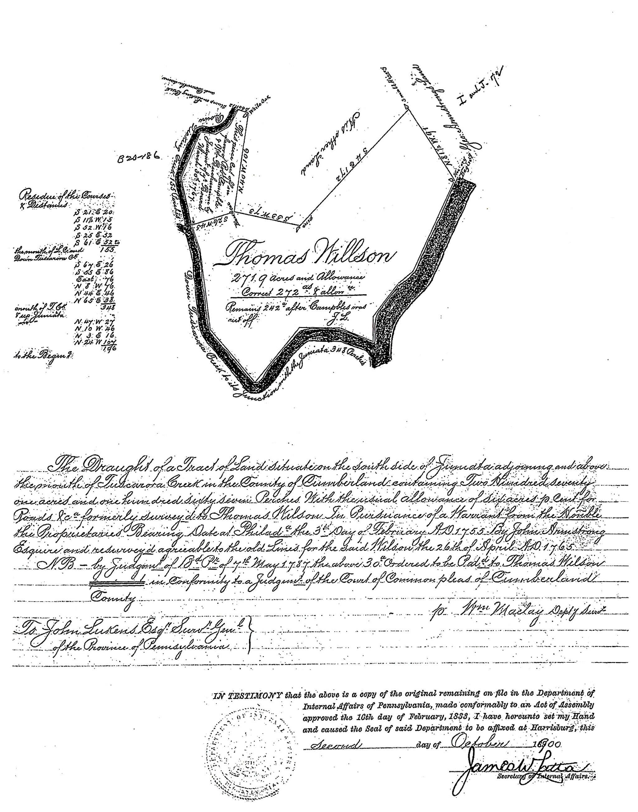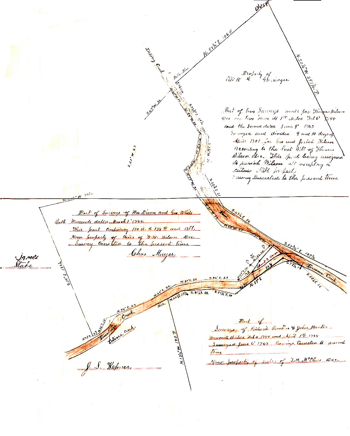 | Survey Map of R. E. Groninger Farm (418K) - n MilfoThis is a survey map of the Robert Elliott Groninger Farm near Port Royal. The map shows the Tuscarora Creek where Licking Creek flows into it. It also shows the original land grant to Thomas Wilson. |