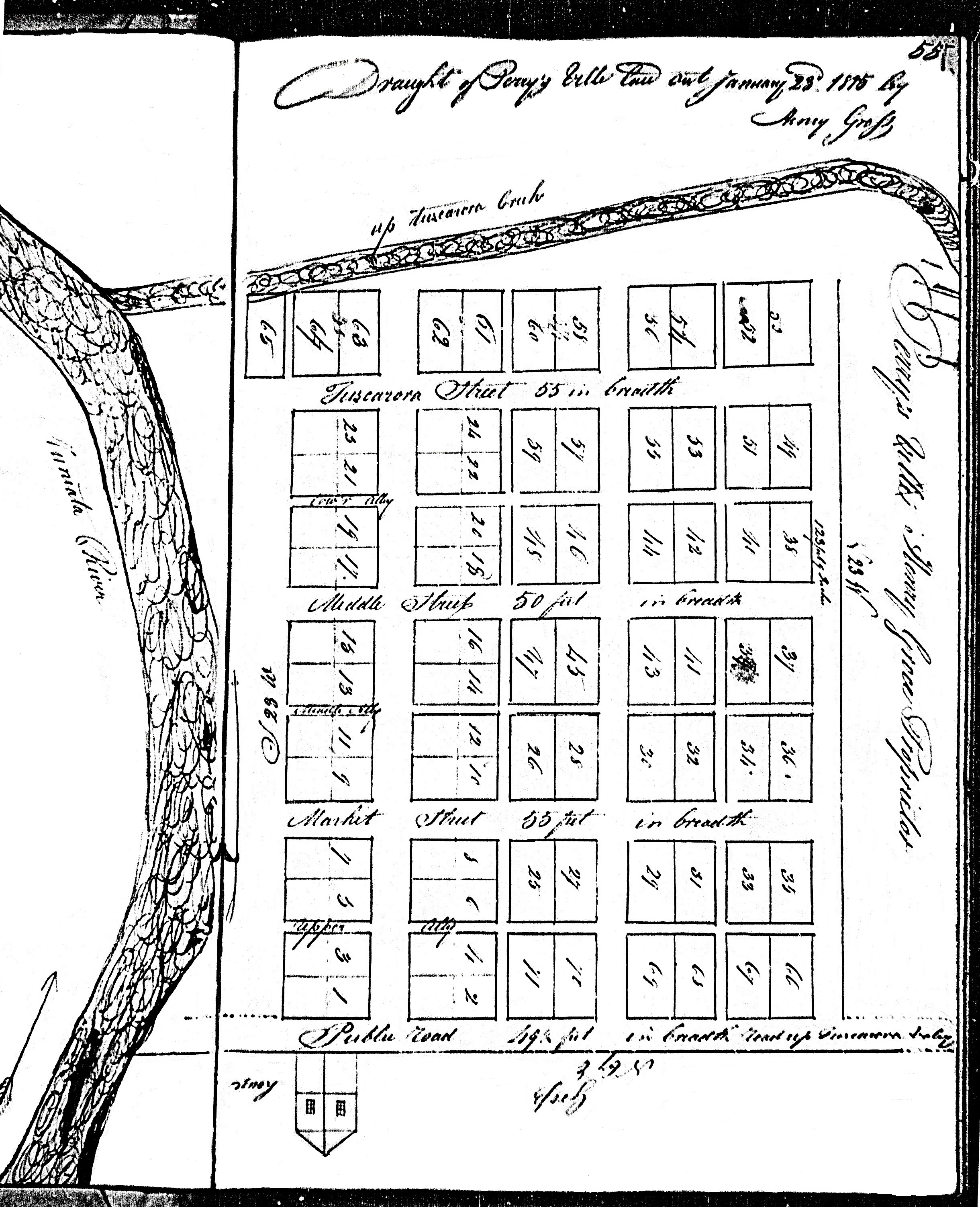 | 1815 Plot Plan Map of Perrysville (Perry's Ville) (1.8MB) - This is the plot Map of Perry's Ville that was recorded by Henry Groce in Mifflin County, April 15, 1815. Henry had purchased 223 of Thomas Wilson's 242 acres of land and laid out the plans for the town. Benjamin Kepner will then purchase the land from Groce on April 16, 1827 and at Benjamin's death it will pass to John M. Kepner. (The Tuscarora Creek can be seen at the top of the map and the Juniata River at the left side.) (Architectural Historian Susan Cabot, who provided the map, believes that the house pictured at the bottom of the map is the original stone "Pomeroy House" and believes that it was built by Thomas Wilson, Sr. before his death. Susan has not been able to find independent proof or documentation of this belief.) |