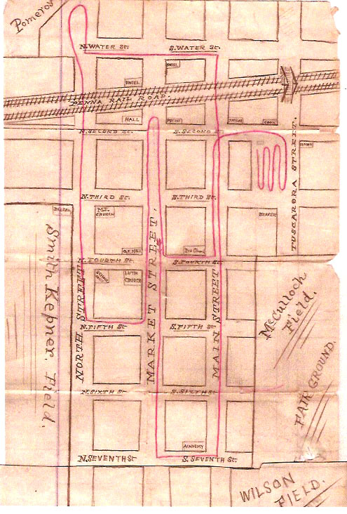 | Parade Route for the Town (155K) - This hand drawn map appears to be a parade route for the town. There is no date on the map but it appears to be after the PRR was built but before the Fairgrounds were move, Note the bridge across the railroad tracks on Tuscarora Street. Also note that Milford Street was designated as North Street. |