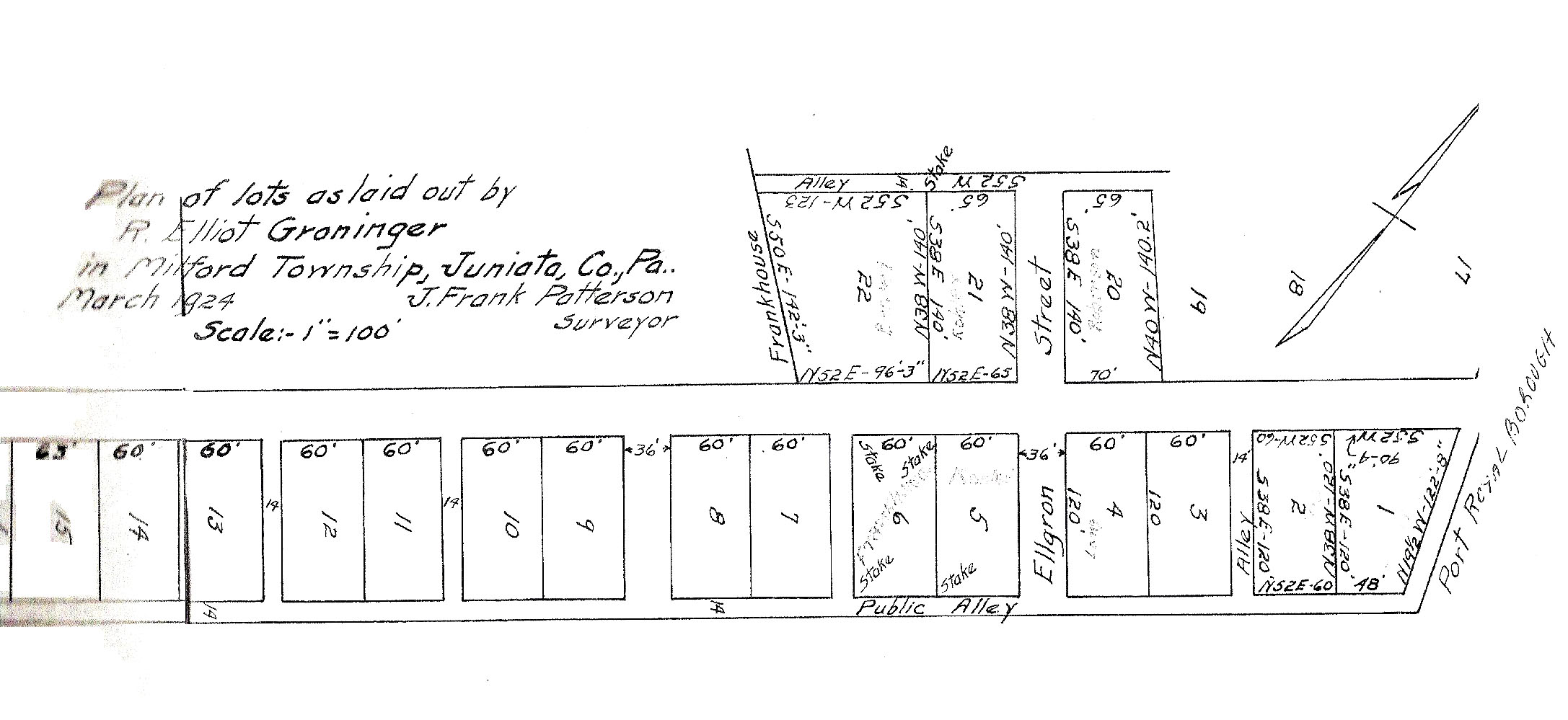 | 1924 Milford Street Extension Survey (309K) - This Survey map was created in 1924 and shows lots laid out by Robert Elliott Groninger in Milford Township adjoining Port Royal. note the inclusion of Ellgron Street. (Ellgron is a combination of Elliott and Groninger - A street by this name does not currently exist as part of the borough.) |